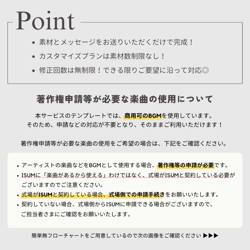 ・内容:BGM変更 ◯|写真・動画変更 ◯(枚数指定なし)|メッセージ変更 ◯