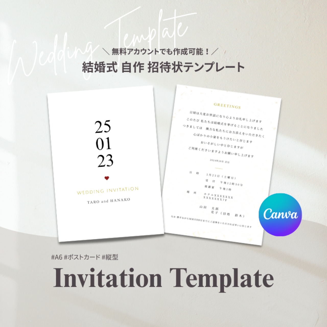 【作成ガイド & 特典付き】 Canvaで作れる 結婚式 招待状 テンプレート | シンプル / 手作り / ペーパーアイテム / 縦型